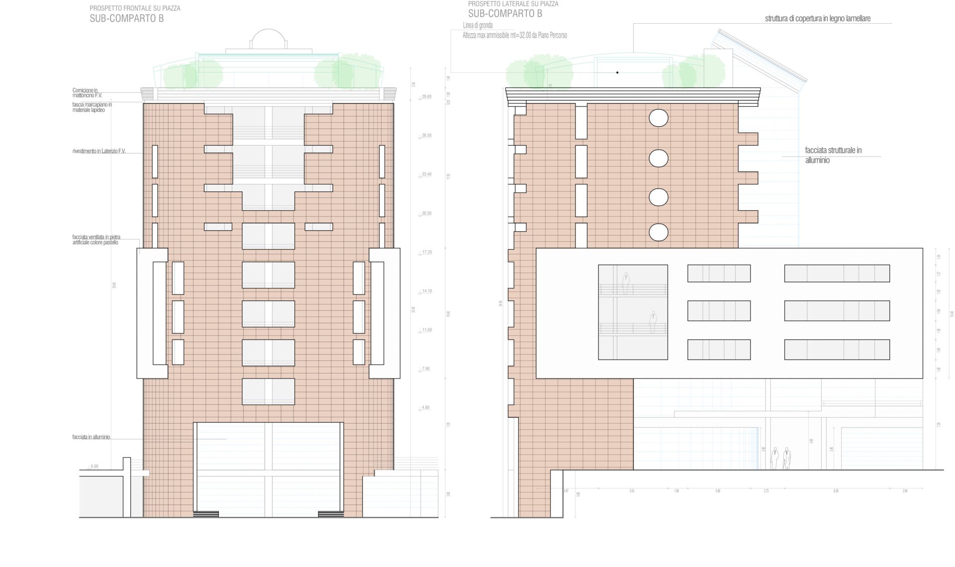 L’edificio in linea con il percorso pedonale, è una sorta di totem con due facciate simmetriche, in contrapposizione con il volume del silos. Le attività commerciali sono dislocate su due livelli, quello piazza e quello percorso. Una sorta di galleria coperta funge da collegamento di tutti le attività; mastri napoletani” sono stati gli artisti che hanno realizzato con tecniche della centinatura le volte ribassate ad intonaco.