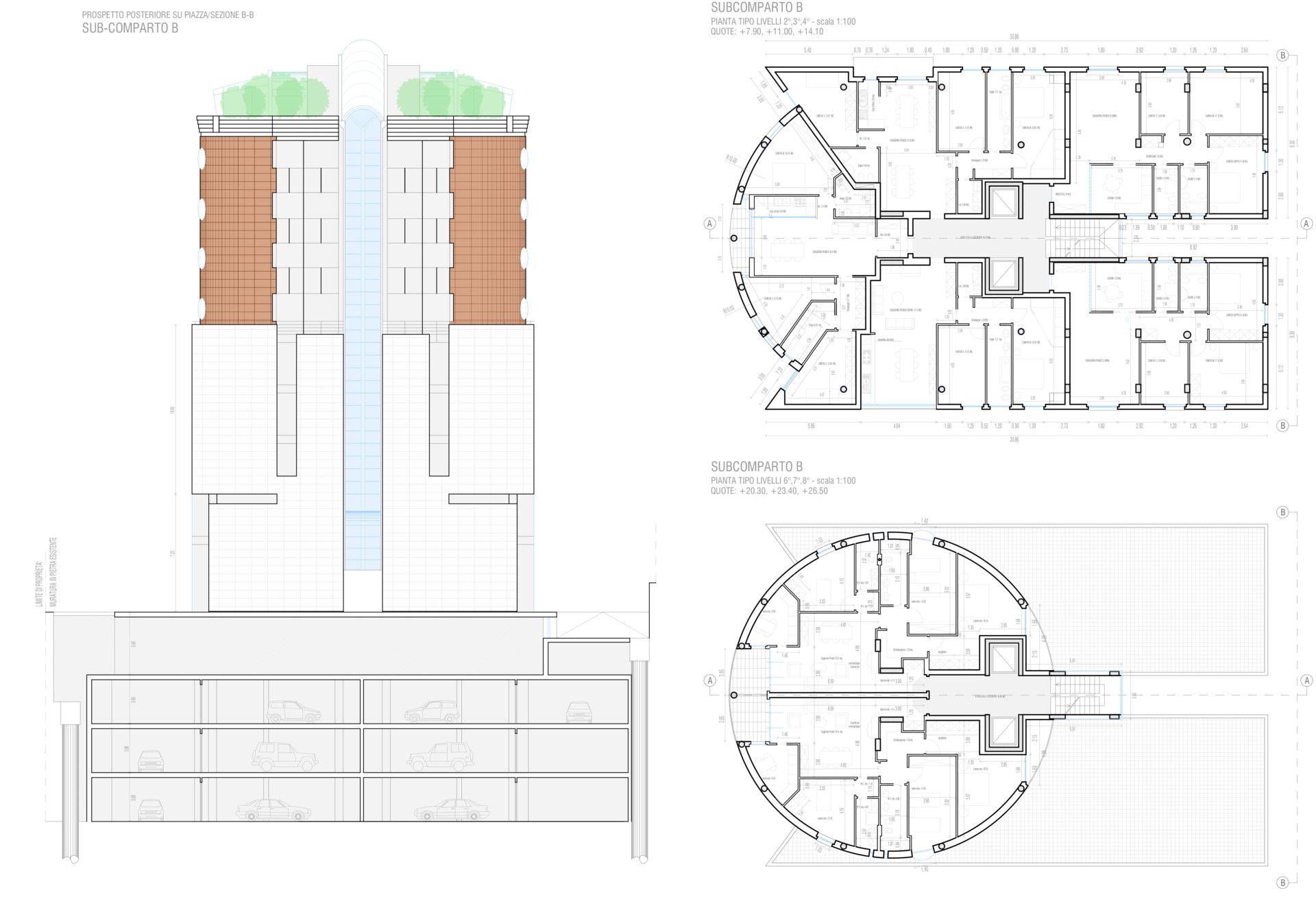 A caratterizzare con forza l’intero piano di recupero, è certamente l’edificio “Silos”, un richiamo alla memoria dei contenitori del grano del Molino. L’edificio è pensato come una sorte di torre cilindrica, contenente attività commerciali, uffici, e residenze, incastrata in una palazzina di base di più piccole proporzioni, allineata ai percorsi pedonali. Lo spazio urbano, nel quale si è intervenuto soltanto recuperando la muratura di confine, destinando la superficie ad usi collettivi è quello interposto tra l’edificio INA e l’Istituto Commerciale “L. Pilla”. all’interno di questo spazio, è stato ricavato un auditorio ad uso comunale, la cui composizione ricalca le linee guide del perimetro, che ribaltate secondo l’asse generano una cavea naturale per il pubblico.