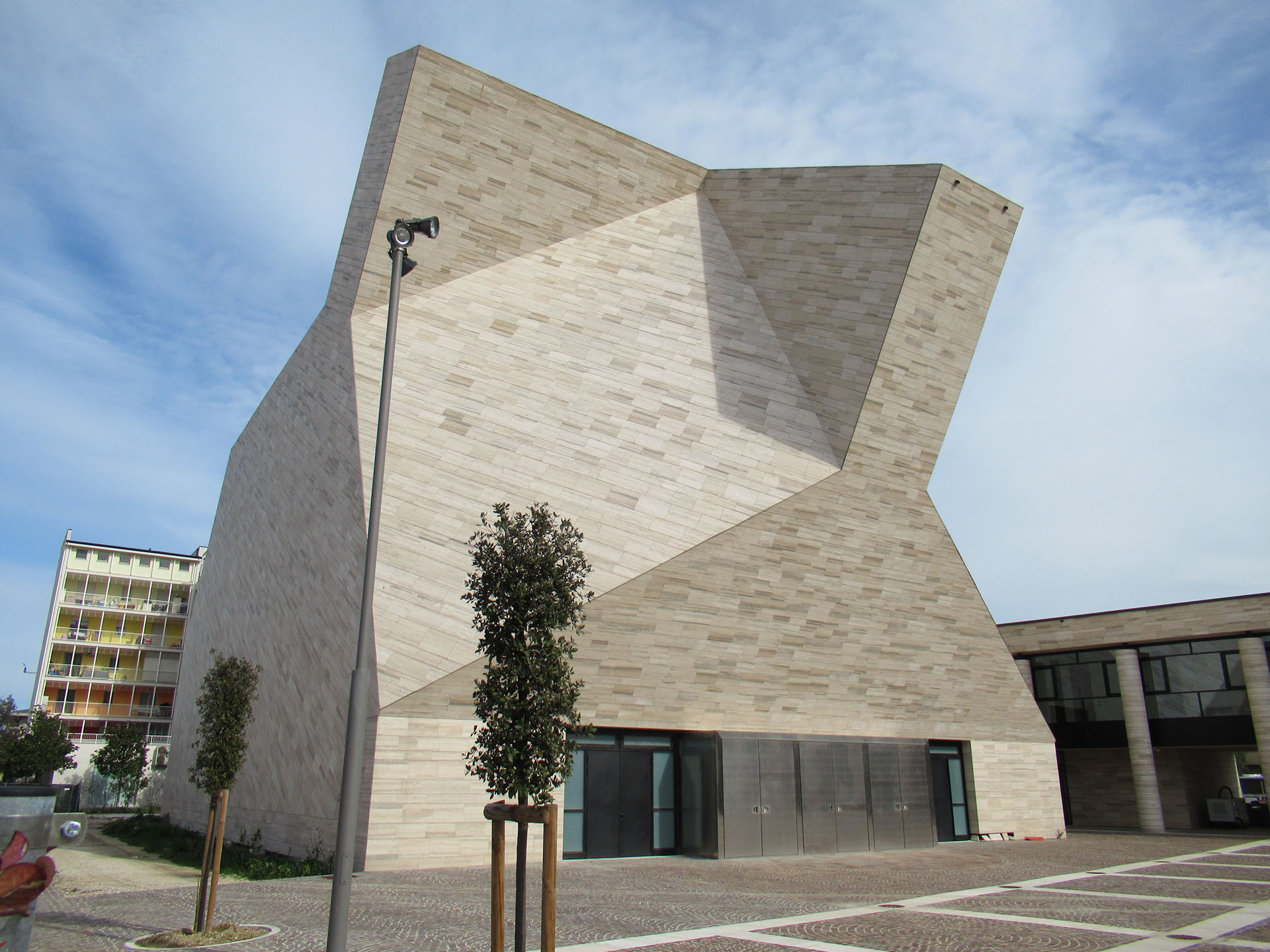 La costruzione del nuovo complesso parrocchiale di San Rocco deriva dall’esigenza di fornire spazi e strutture adeguate ad un ambito cittadino in continua crescita e sviluppo. Il complesso non ancora inaugurato si compone di alcuni edifici tra cui: la Chiesa, la Cappella Feriale, il Centro Parrocchiale, il Colonnato dell’ala sud e il Sagrato. Il progetto si configura quindi come occasione per il riordino del contesto urbano e come una vera e propria ricucitura degli spazi discontinui presenti nel tessuto edilizio. Il corpo di fabbrica della chiesa si presenta all’esterno come una volumetria compatta, mossa in una sagoma tesa verso il cielo e irradiata all’interno dalla luce filtrata dal lucernario a croce greca. L’impianto configurato in planimetria come un grande quadrato concluso da un’abside maggiore e due minori laterali subisce in alzato una profonda metamorfosi, dato che inclinandosi assume una conformazione a croce chiaramente distinguibile nel panorama urbano.