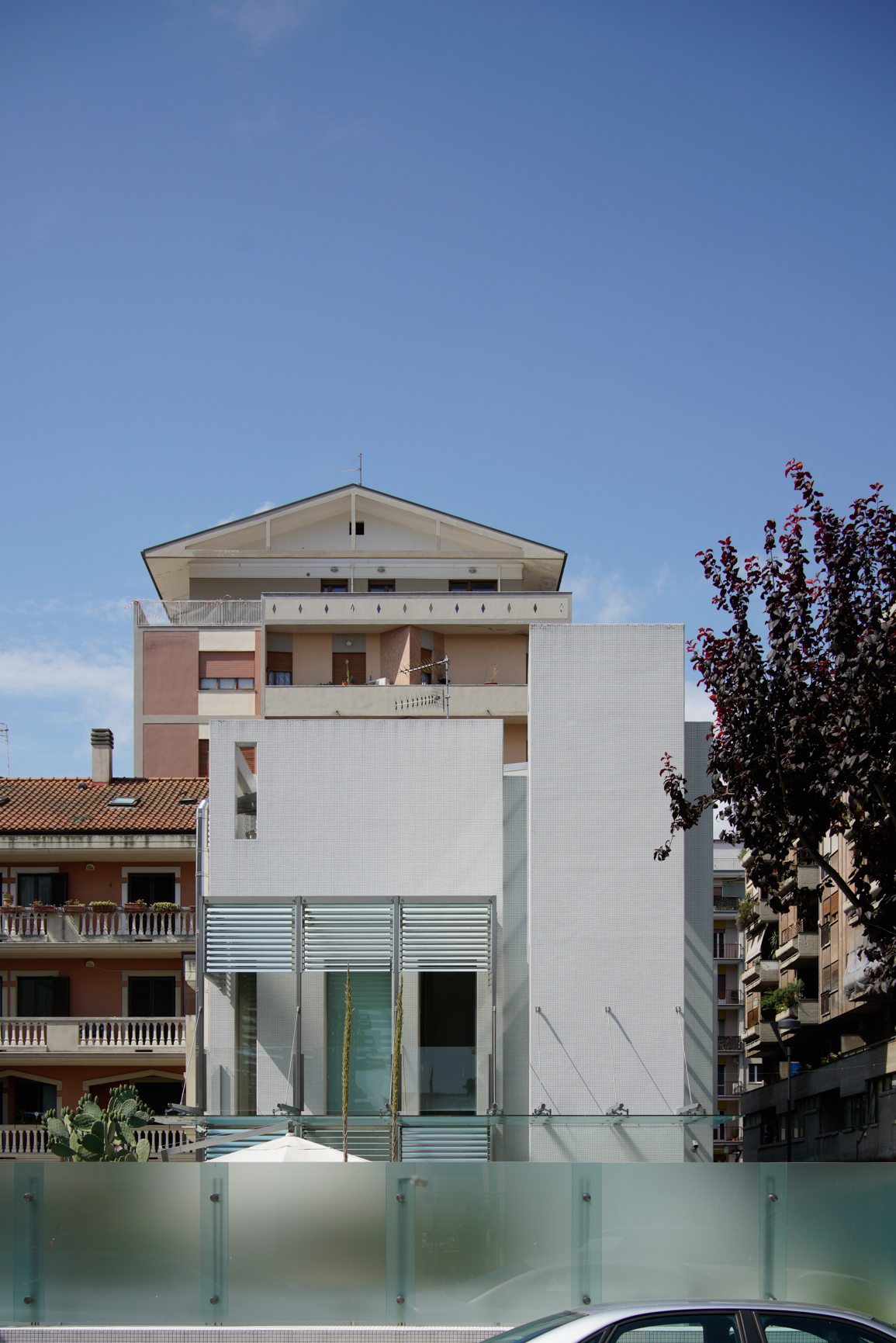 La villa nasce dalla demolizione di una cabina di trasformazione in una posizione centrale della città; sebbene l'edificio configuri un volume del tutto nuovo, la morfologia verticale della preesistenza viene ereditata dalla nuova costruzione che presenta nell'elevato la sovrapposizione di due volumi stereometrici. Quello principale ospita il soggiorno al piano terra, in continuità col giardino "umido", una stanza da letto padronale al piano superiore e un solarium in copertura; il secondo segna la presenza della distribuzione verticale. Il giardino, inoltre, presenta una grande apertura triangolare che porta luce a due piani interrati che ospitano delle stanze e una taverna e termina con un secondo giardino. I materiali utilizzati sono il mosaico bianco per le facciate, cemento e intonaci bianchi per gli interni e acciaio per gli infissi.