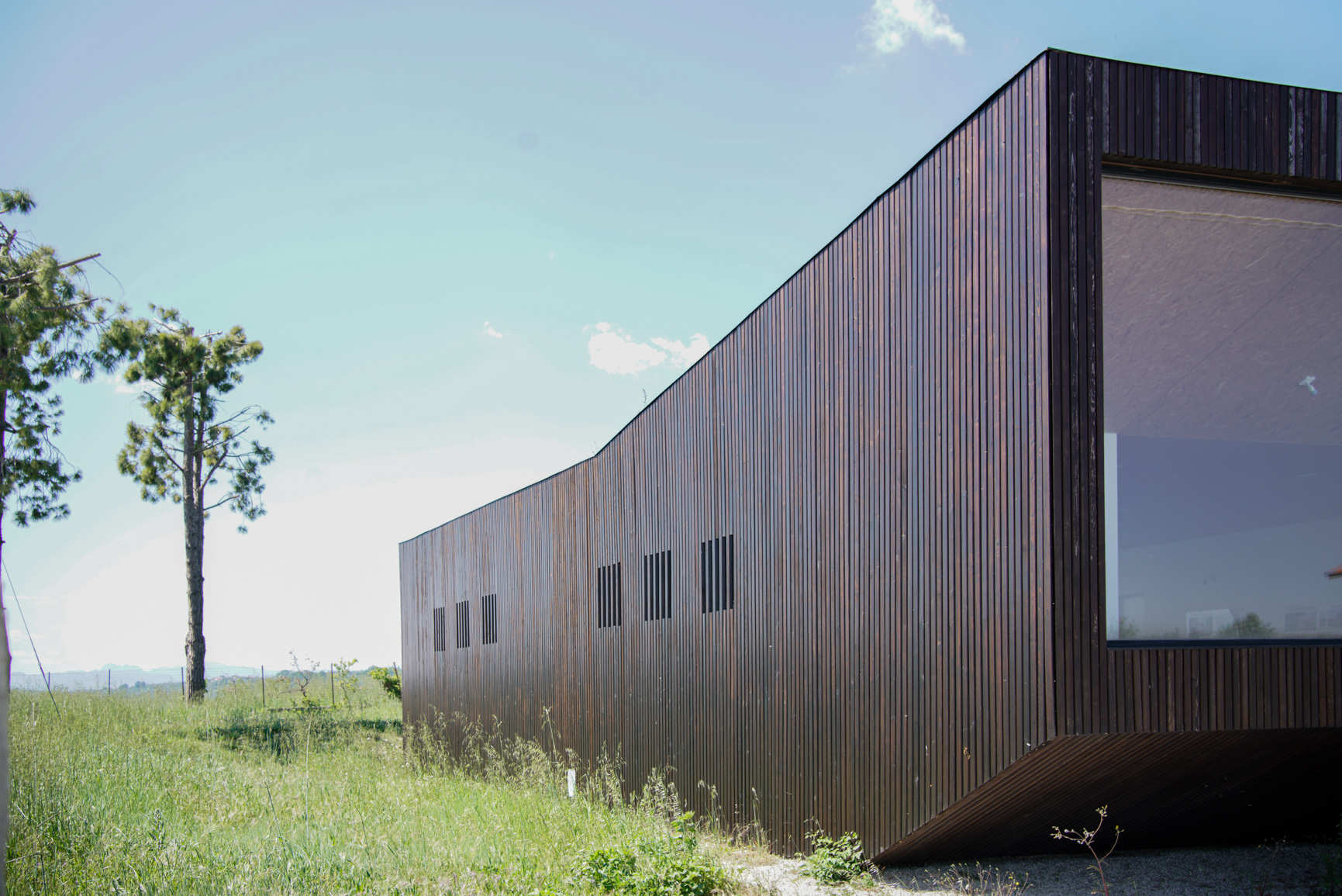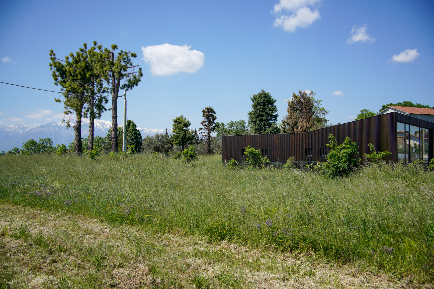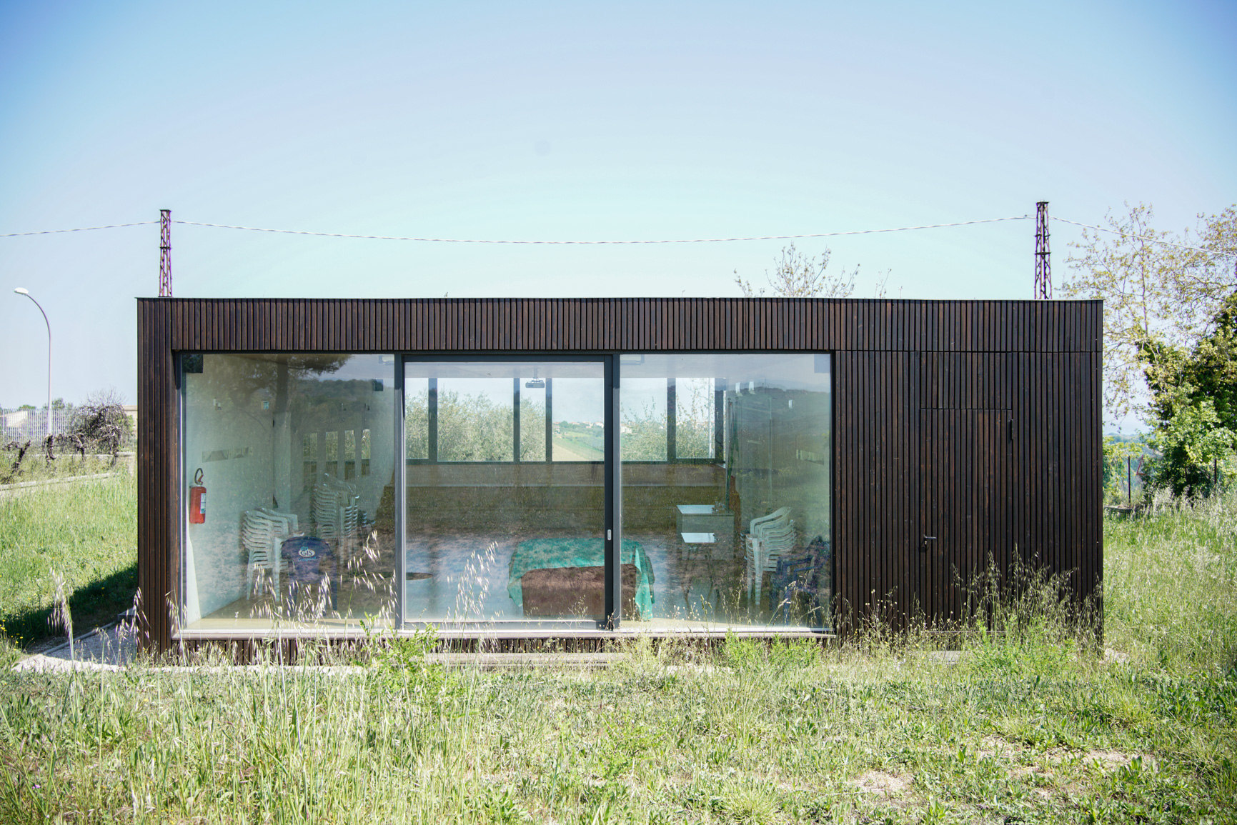 la montagna con le valli verso il mare, la leggera deformazione del parallelepipedo consente di realizzare una piccola cavea con gradonata e tagliare la vista della strada e delle macchine dall'interno; nello spazio della sala è anche presente un volume servente. Tutta la costruzione è in legno a eccezione delle opere di fondazione.