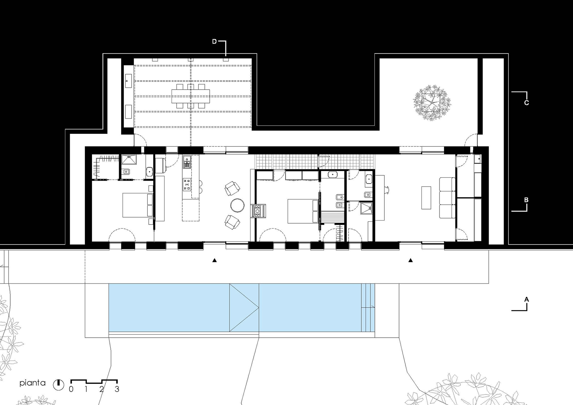 La permeabilità degli ambienti principali verso il mare a sud e verso i due cortili a nord, attraverso ampie bucature, dà la percezione che il paesaggio attraversi lo spazio interno della casa. All’esterno, lungo il muro, pienamente integrata con l’impianto insediativo, è disposta una piccola piscina.