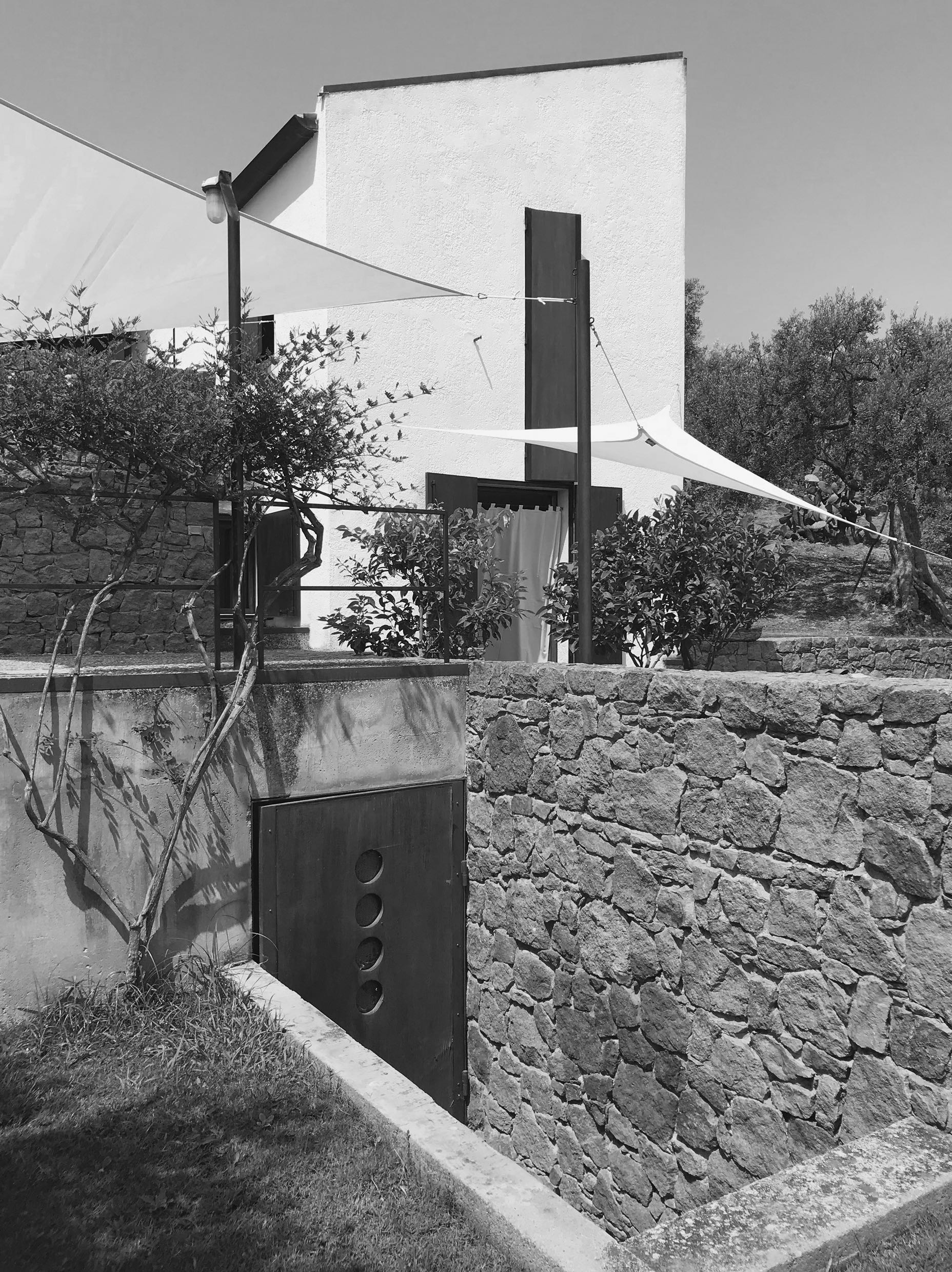 Il principio insediativo di una pianta a L, che definisce una corta interna racchiusa tra i due bracci simmetrici della costruzione e aperta verso la linea dell’orizzonte marino, caratterizza la casa Rizzo, immersa tra i boschi e la campagna nel territorio di Cefalù. La geometria che disegna la casa si estende agli spazi esterni e prende corpo nei profili di acciaio che, con partiture ortogonali, contengono il getto di cemento e piccoli ciottoli di mare delle pavimentazioni. Muri in pietra di quarzarenite, reperita in situ e montata a faccia vista, delimitano lo spazio per la cucina all'aperto e definiscono i salti di quota che conducono alla piscina.