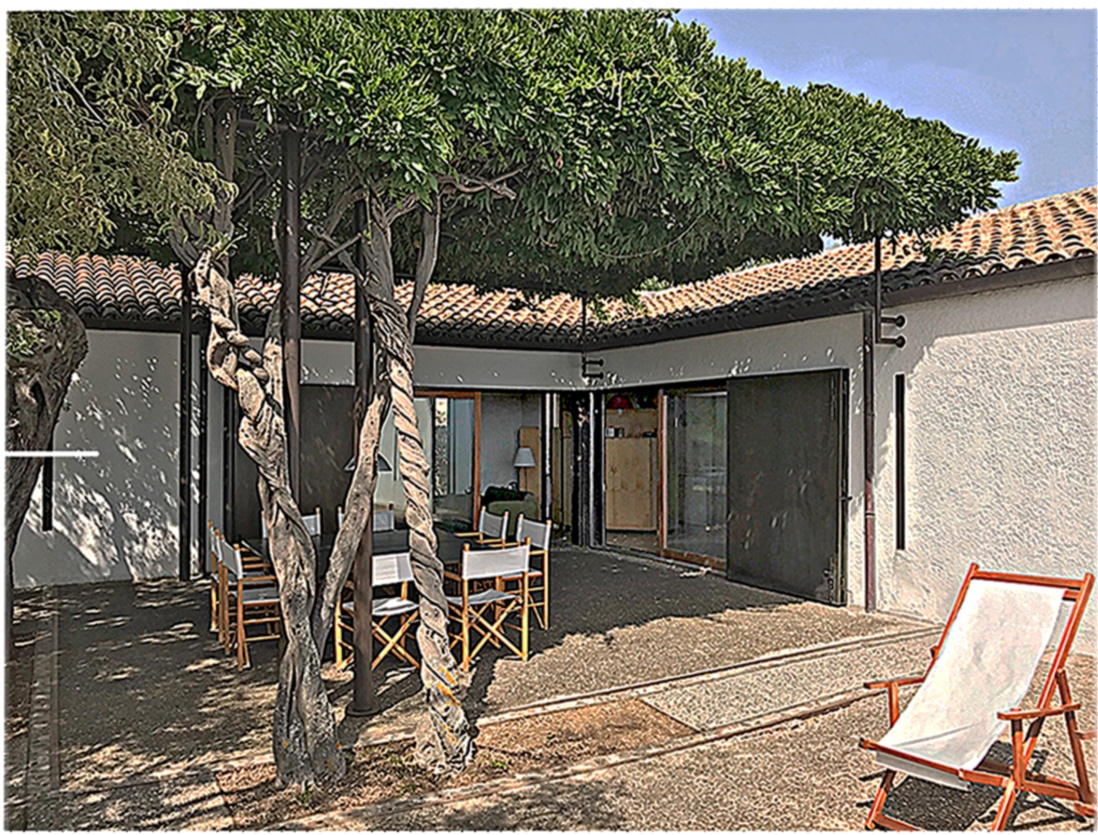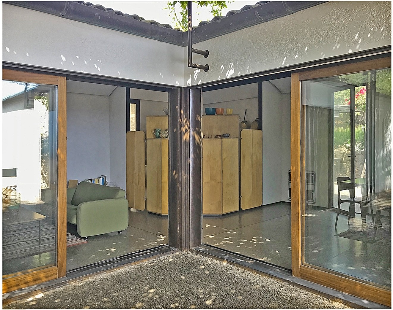 All’incrocio dei due bracci della casa si collocano gli spazi comuni, cucina e soggiorno, che hanno rispettivamente due estensioni all’esterno, nella zona per cottura all’aperto sul retro e nell’area della corte coperta da una pergola. Una colonna circolare in acciaio segna l’angolo, accoglie le battute delle due ampie vetrate del soggiorno, e delimita la visione del paesaggio marino. Lo spazio interno è contenuto da voltine in tavelline Perret intonacate che garantiscono, grazie all'intercapedine ventilata sotto la falda inclinata, una temperatura interna ottimale. La casa si apre verso l’esterno scegliendo gli scorci di paesaggio e modulando l’ingresso della luce: le finestre sono strette fenditure verticali, talvolta strombate, o ampie vetrate scorrevoli.