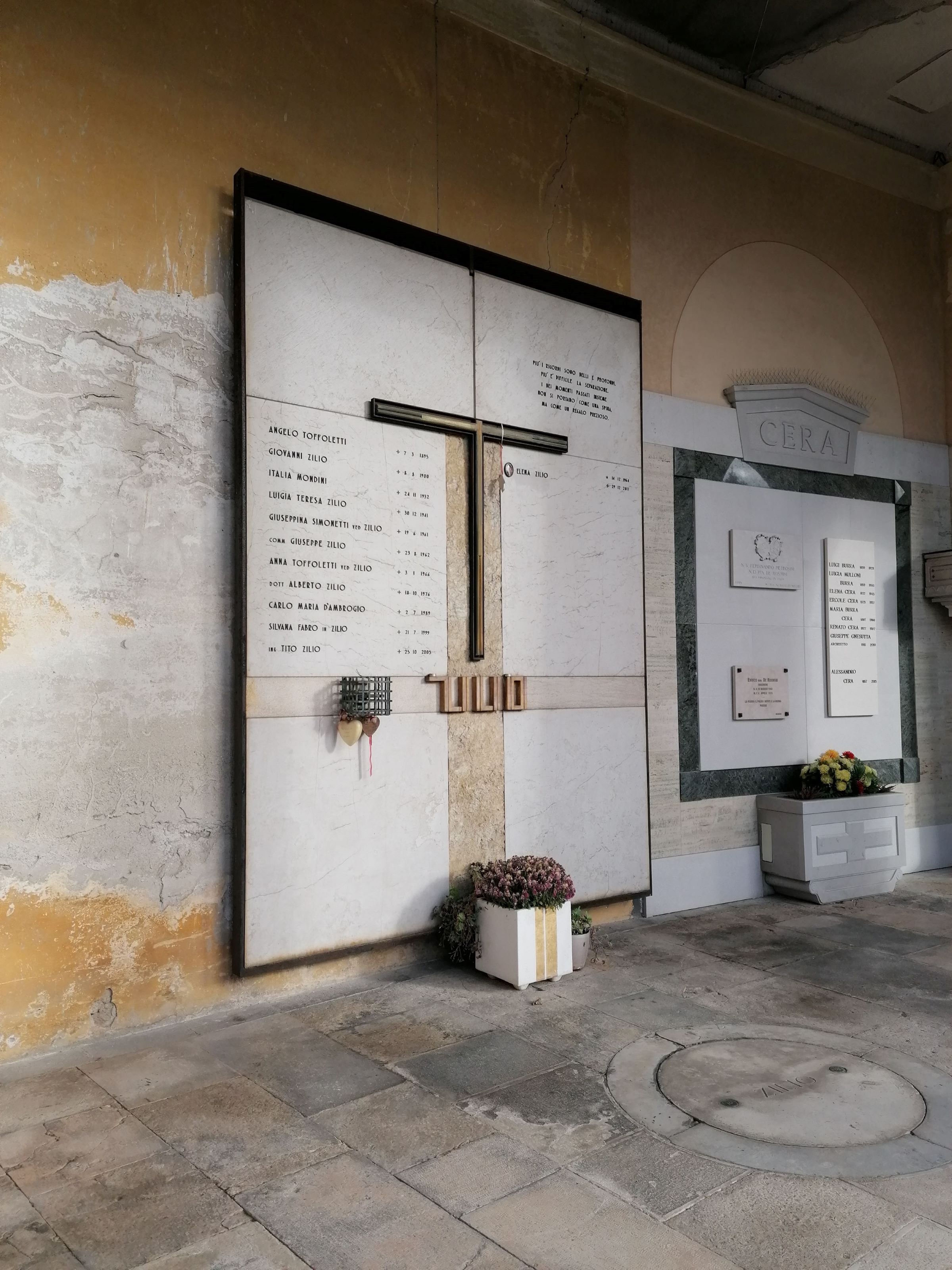 Nei punti di giunzione delle prime quattro piastre, a partire dal basso, è inserita, in orizzontale, una fascia di pietra bocciardata (cm 20), che serve da guida per due elementi. Al centro, spiccano le lettere in rilievo, rivestite di foglia d'oro, che formano il nome "ZILIO", declinate a partire dalla ripetizione di uno stesso modulo verticale unito, per tre caratteri, a un segmento orizzontale; a sinistra, invece, è fissato un portalampada cubico realizzato con una griglia in ferro scuro. I due segmenti di una seconda banda verticale, in pietra d'Istria a spacco di cava e larga il doppio (cm 40), si intersecano alla prima, generando una croce di foggia astratta, appoggiata, in basso, a una mensola metallica, ora coperta da un vaso quadrangolare aggiunto posteriormente. Sulla porzione superiore, corrispondente al centro della stele, si sovrappone parte dell'alloggiamento in ferro che racchiude una seconda croce, stavolta commissa. I bracci di questa filiforme scultura sono formati da due tondini accoppiati di Münzmetall spazzolato parzialmente ricoperti da un listello piatto dello stesso materiale. Il braccio verticale del crocifisso prosegue idealmente nella scanalatura tracciata tra le due lastre di botticino superiori. Il telaio in ferro, esuberante rispetto a quest'ultima parte, genera in alto una fascia scura, che chiude, come una sorta cimatio antica, l'impaginato della stele.