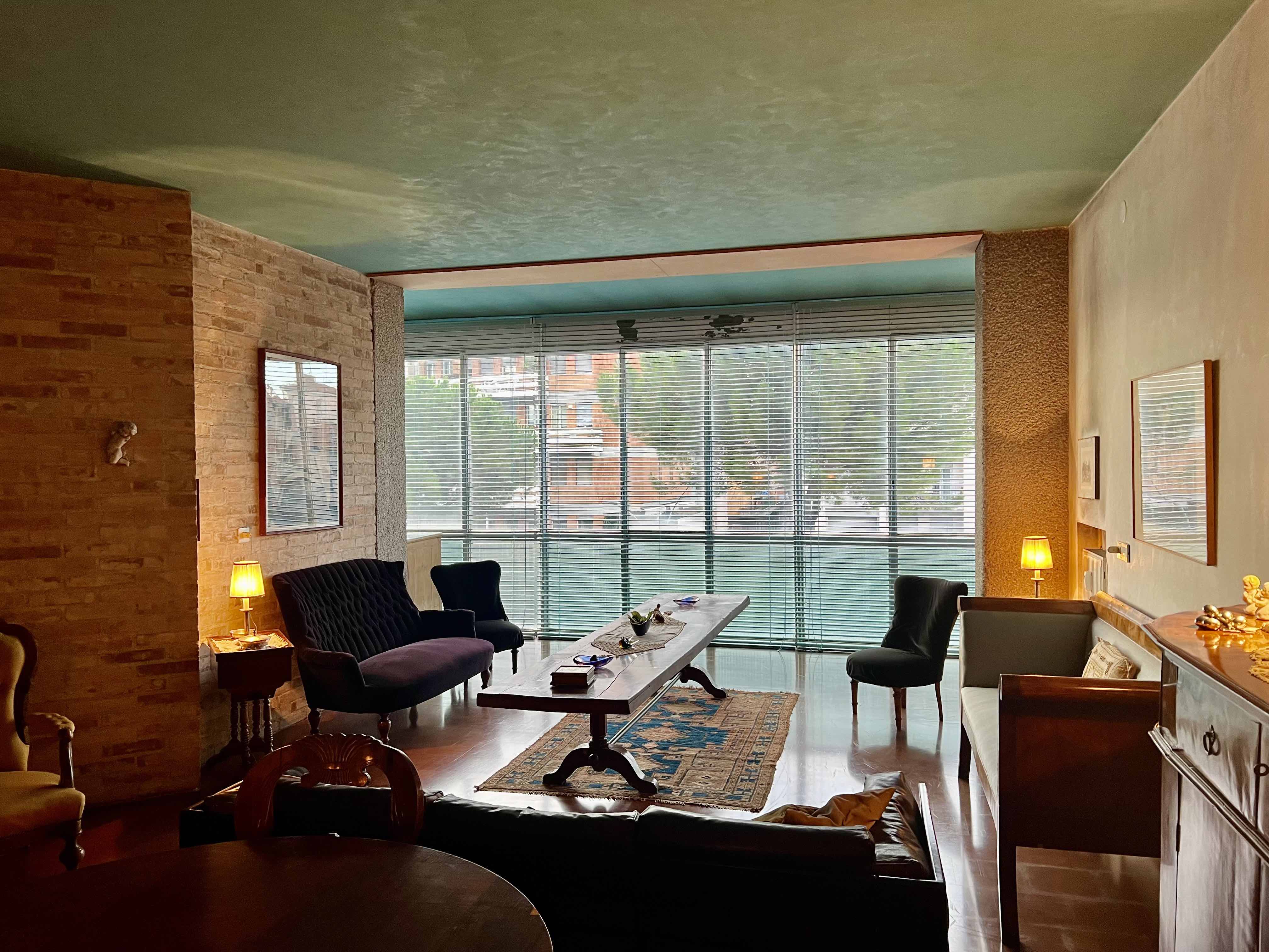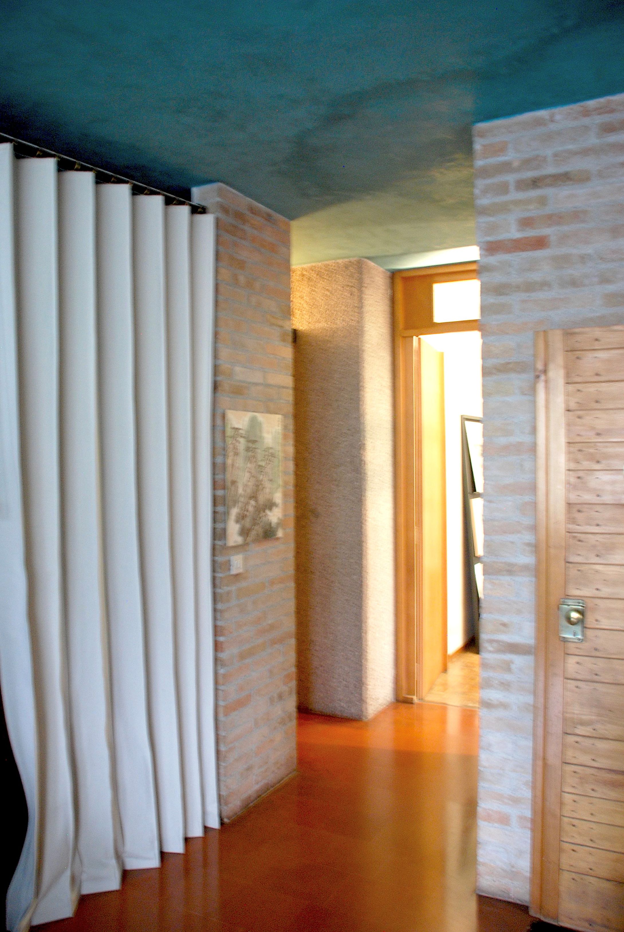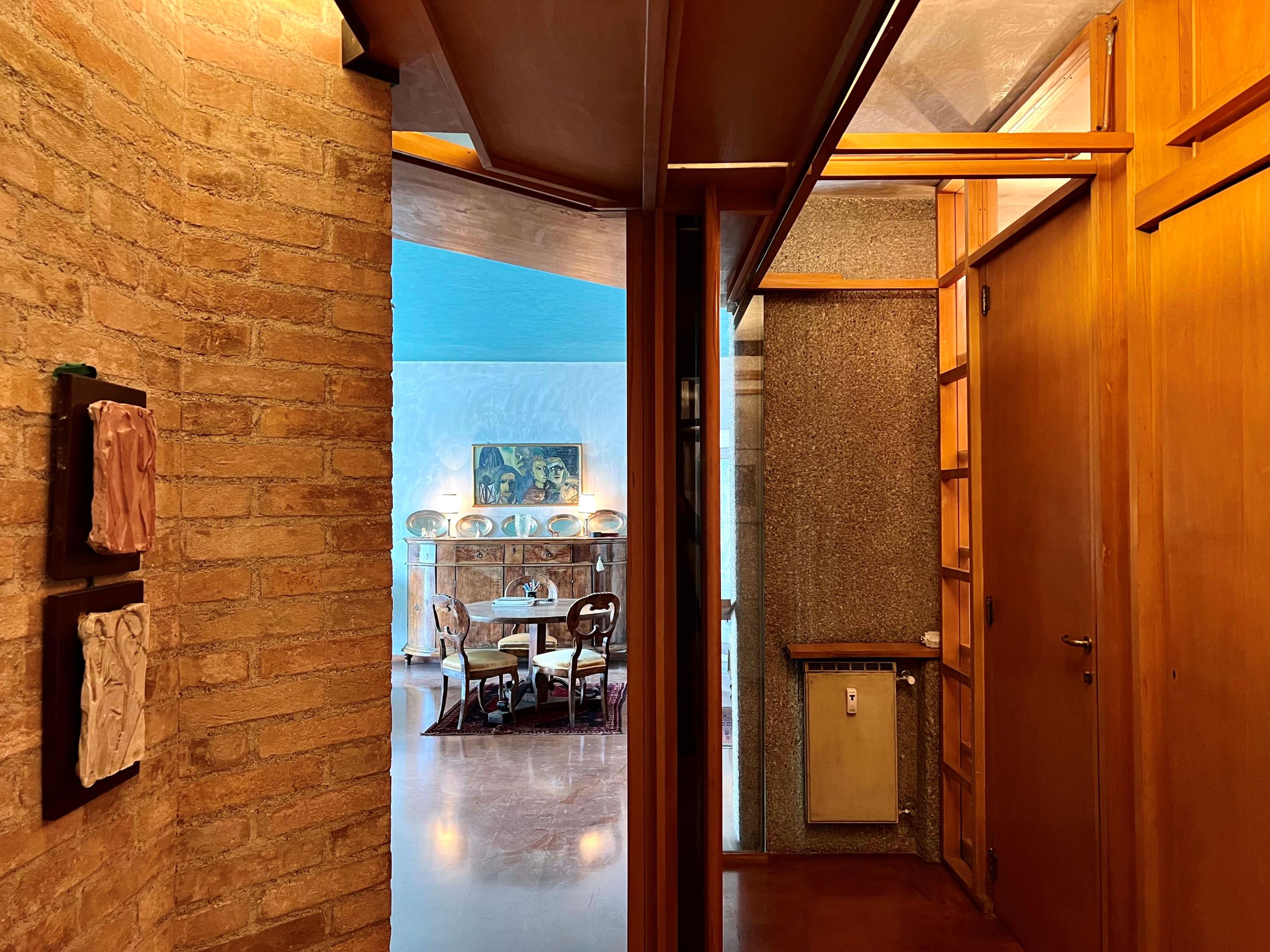 Superato un vano quadrato d'ingresso, si accede a un atrio – connesso al soggiorno, all'office-cucina e alla zona notte – che si qualifica come uno degli spazi più elaborati dell'appartamento. La sua configurazione, infatti, è determinata da una serie di pannelli e listelli in legno realizzati dagli artigiani della falegnameria Maiero, impegnati anche nel cantiere della Villa Veritti (1955-1961). Scarpa è molto attento a non trasformare questi elementi in barriere fisiche o visuali, calibrandone la posizione e l'altezza, anche in relazione ai sopraluce vetrati; in particolare, il pannello che separa l'atrio dal soggiorno, corredato da un elaborato "spioncino", si stacca sia dal pilastro a cui è ancorato, sia dalla porta-pannello di accesso all'ambiente, offrendo a chi guarda un'anticipazione visuale dell'interno. Il soggiorno e l'office-cucina sono divisi da una parete obliqua in muratura di mattoni, elemento chiave per l’organizzazione della zona-giorno. La luce proveniente dalla vetrata sud si aggrappa alla superficie scabra dei mattoni, prodotti dalla Fornace Cattarossi di Qualso, segnala Scarpa in un disegno (Archivio Zilio, Udine), diffondendosi gradualmente fino a lambire il volume della canna fumaria, rifinito con una scialbatura liscia grigio chiaro; anche il cemento dei pilastri preesistenti viene scalpellato allo scopo di calmierare l'incidenza luminosa. Come in ogni altra opera di Scarpa un ruolo ugualmente rilevante è affidato ai piani del pavimento e del soffitto, realizzati rispettivamente "in cotto come quello [dell']avv. Veritti", come rivela un appunto (ivi), e in stucco lucido turchese. In alcuni disegni, l'architetto prevede di inserire tra la vetrata esterna e gli ambienti interni dei diaframmi mobili, in modo da garantire l'accesso a una sorta di "giardino d'inverno", dove inserire vasche d'acqua e piante fiorite; la soluzione, però, rimane sulla carta, allo stesso modo dell'ipotesi di realizzare un elaborato camino nel soggiorno, memore del fogolâr di tradizione friulana.