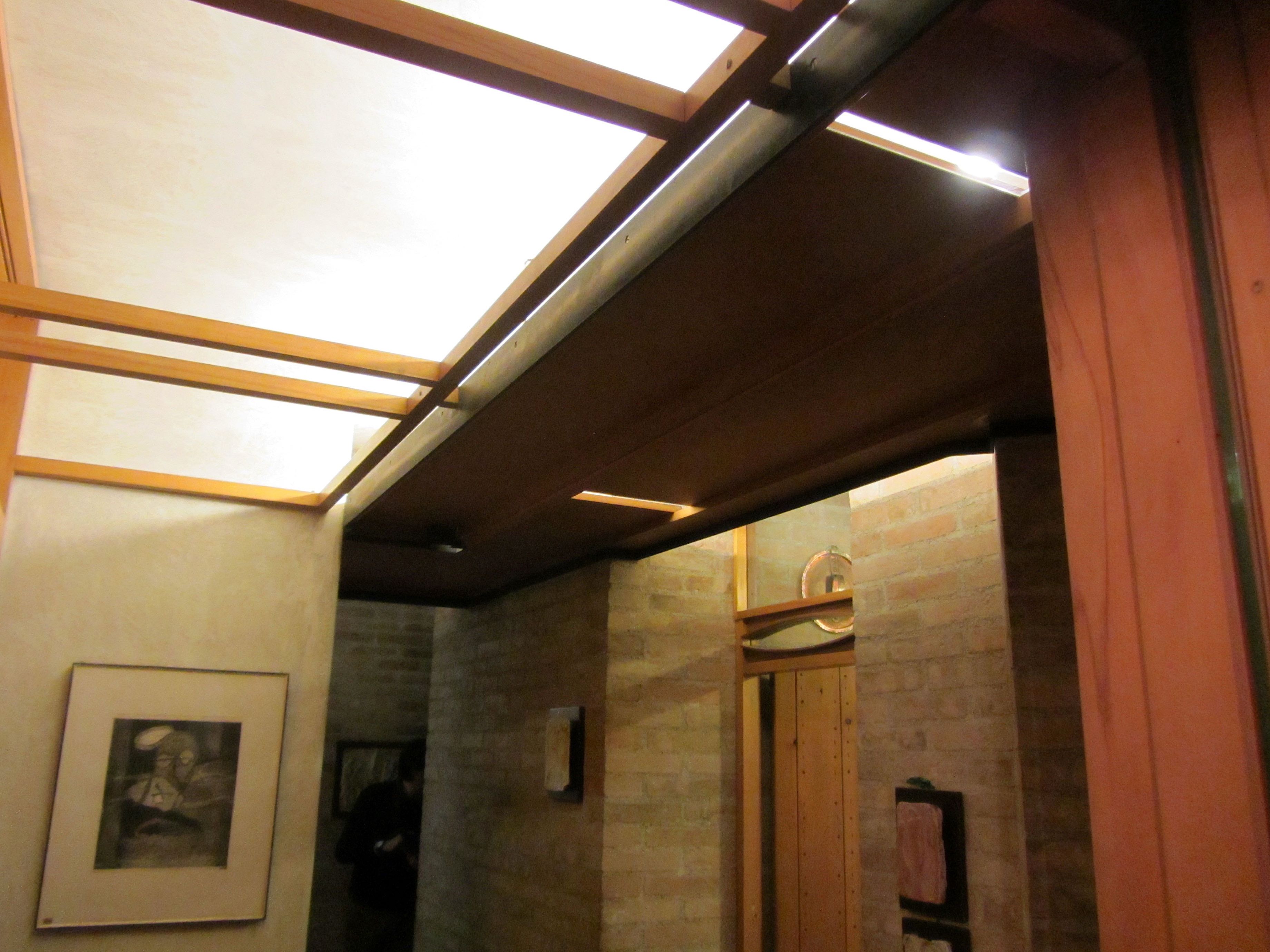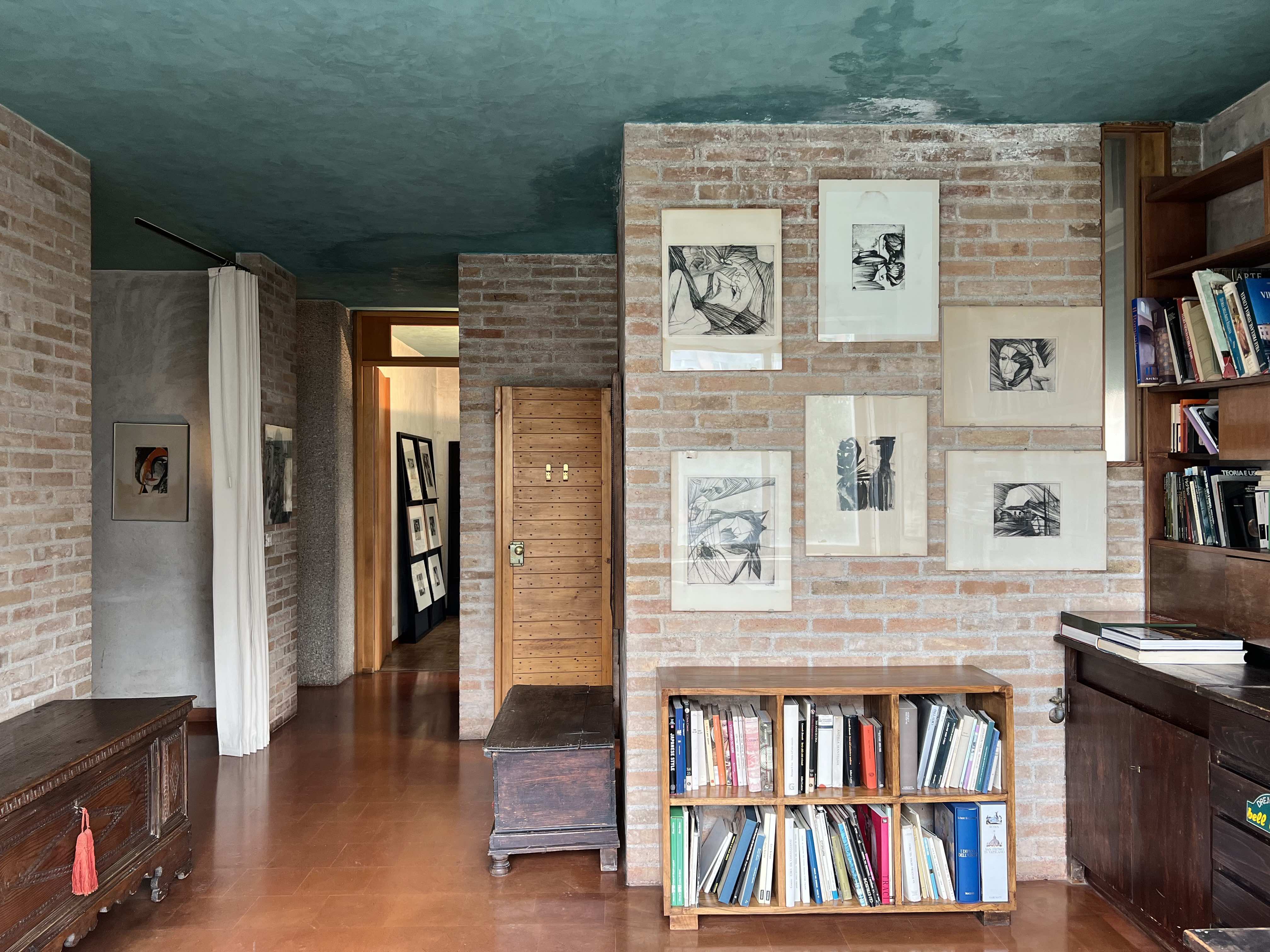 Per connettere idealmente i percorsi interni, Scarpa predispone ancora un particolare sovrapporta ligneo a forma di mandorla allungata, presente nell'accesso all'office e nel diaframma vetrato che lo separa dalla cucina, nell'adiacente sala da pranzo e nell'ingresso allo studio di Carla Zilio. In questo spazio, particolarmente importante nella genesi del progetto, la vetrata integrale delle altre stanze diventa una lunga finestra, che modula la luce; oltre alla libreria, Scarpa studia qui un ambiente dentro l'ambiente, ovvero una sorta di nicchia-alcova, per il riposo dell'artista, schermata da una scultorea tenda chiara ondulata appesa a un'asta orizzontale pivotante.