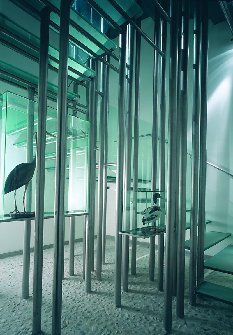 Al primo livello, gli espositori e i pannelli sono inseriti tra una parete continua in vetro acidato e una di fondo in cristallo, a formare un allestimento tridimensionale che nasconde la struttura muraria e al tempo stesso sembra smaterializzarsi a vantaggio degli oggetti esposti. Al secondo livello, le vetrine si trasformano in ambienti, spazi in cui entrare, ascoltare suoni, camminare sopra i ciottoli del letto fluviale. La scala di collegamento tra i due livelli non è un semplice percorso ma è concepita come un canneto di tubolari d’acciaio inox; nelle grotte al piano interrato sono invece esposti reperti e fossili della media valle del Tevere, in teche poggiate su piedistalli in lamiera stirata.